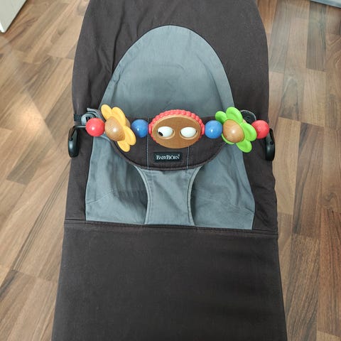 Hyvässä käytetyssä kunnossa oleva Babybjörn -sitteri lelukaarella. Käännettävä kangas on ehjä ja juuri pesty. Ei silmin havaittavia tahroja tms. Lelukaaressa tavanomaista kulumaa. Lemmikkieläimetön talous.
