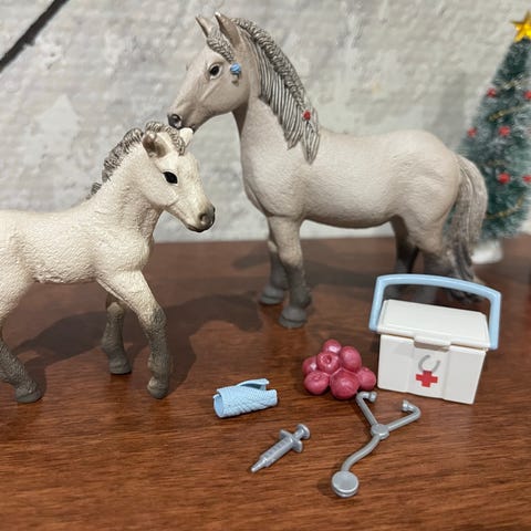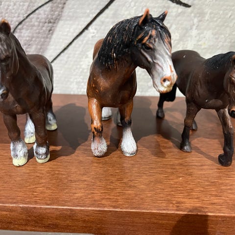 Joukko hevosia, joissa kaikissa on puutteita. Yksi ei ole Schleich, Issikan harja ja häntä on maalattu mustaksi, Knabstruoin jalka on paikattu, Quarterilta toinen korva pois ja muissa paljon maalikulumaa. Näillä voi kuitenkin leikkiä ihan mukavasti. Ja jos harrastat näiden muokkaamista, niin siihen oiva sakki!