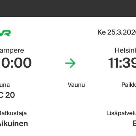 Käy mihin tahansa junaan Vaasa-Tervajoki välillä ja toisin päin. Ilmoita juna ja paikkatoive niin varaan lipun. Jäljellä 8 kpl. Voimassa 28.4.2026 asti.