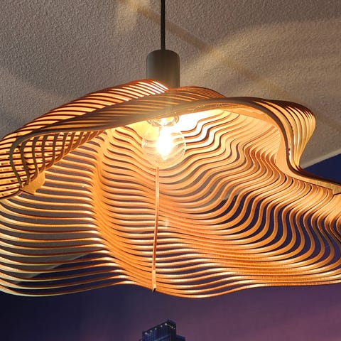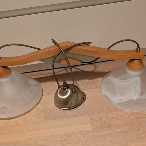 Maalattu teräsoksa 60 X 70 cm lankakiinnityksellä. Valonlähde E27- kantainen spotti. Teräsoksa muodostaa kauniin varjon lattia-/pöytäpintaan. Pieniä lankojen päässä olevia kiinnitysrenkaita puuttuu 2 kpl. Renkaat voi korvata helposti, saatavilla askartelukaupoista.