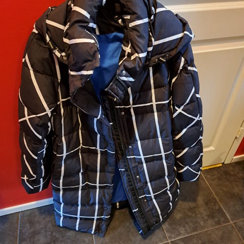 Marimekon musta Aillon Solid untuvatakki, 80% untuva 20% höyhen. Koko merkintä XXS mutta on reilu, vastaa mielestäni kokoa S koska on A linjainen ja väljän mallinen. Huppu on irrotettava. Lämmin takki kylmissäkin sääoloissa. Beige musta Kivet kuosi vuorissa. Piilonapitus ja kaksisuuntainen vetojetju.