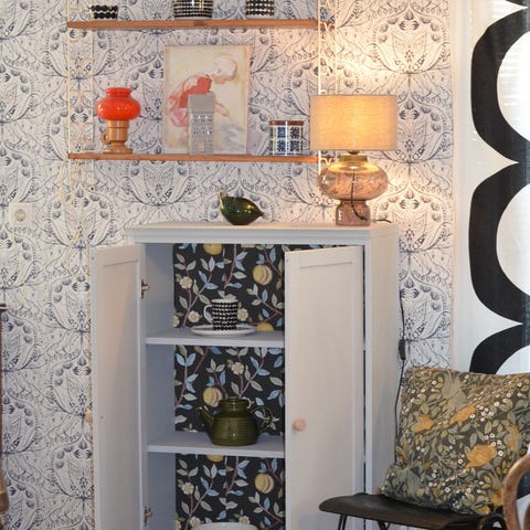 Kaapin takaseinä on päällystetty keväisellä kukkapaperilla.