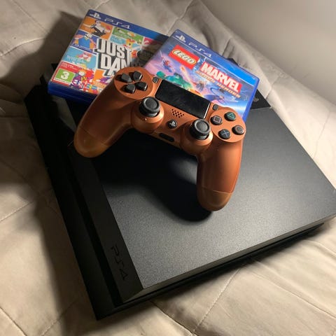 Sony Playstation 4 pelikonsoli musta väri. Sisältää ohjaimen ja useita pelejä: NHL, FIFA 18, Ghost Recon ja Grand Theft Auto V.