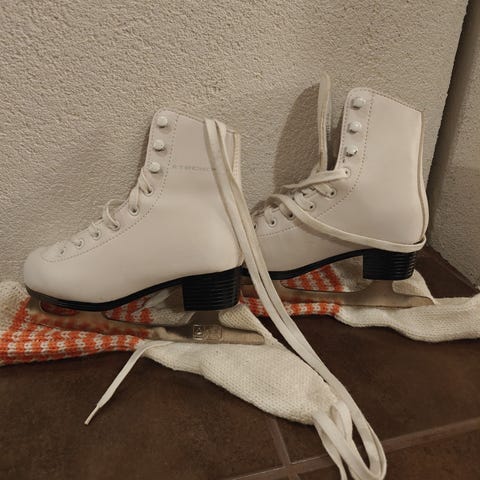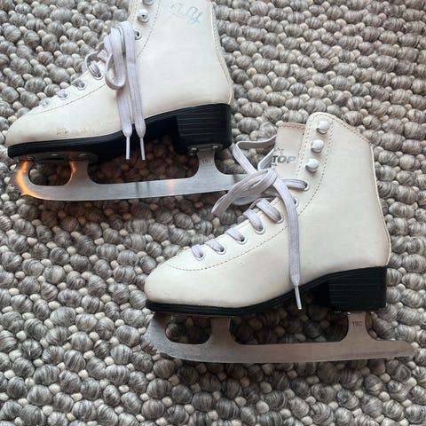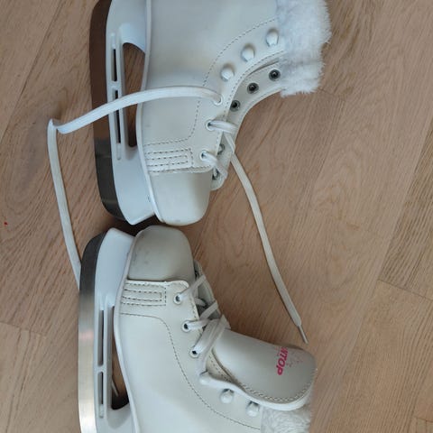 Cantop koon 31 vähän käytetyt lasten kaunoluistimet, malli Lily JR. Valkoiset, siistit ja hyväkuntoiset. Pieniä jälkiä pinnassa, muuten kuin uudet. Sisällä lämmin tekoturkisvuori. Nauhakiinnitys.