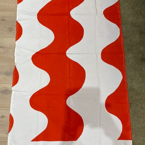Marimekko Maija Isolan suunnittelema ”Lokki” pöytäliina harmaa, jossa musta aaltokuvio. Materiaali puuvillaa. Kangas vuodelta 1999.