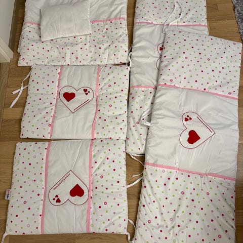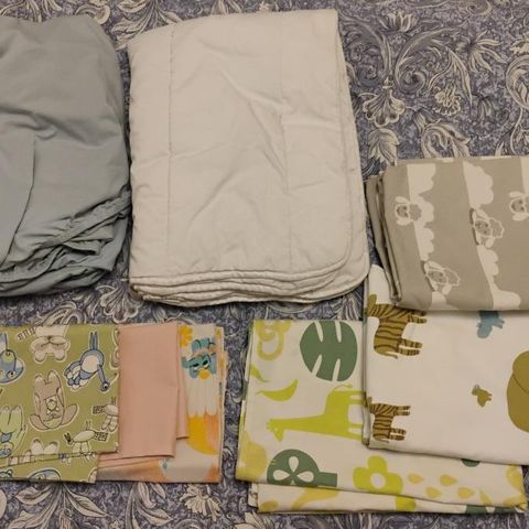 Pinnasängyn patja, vauvan peitto, liinavaatteita ja huppupyyhkeitä