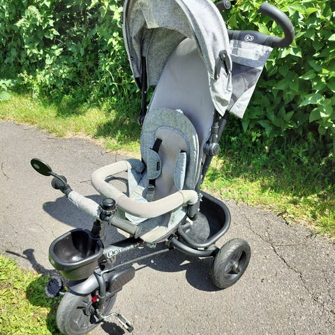 Kinderkraft-merkin Aston-kolmipyörä, jossa on säädettävä työntöaisa vanhemmalle. Siinä on suuri, irrotettava kuomu ja käännettävä istuin. Kolmipyörässä on viisipistevaljaat parasta mahdollista turvallisuutta varten, selkänoja ja jalkatuki. Sen takaosassa on lisäksi tilava kori, jossa lelut pysyvät turvallisesti mukana ajon aikana.