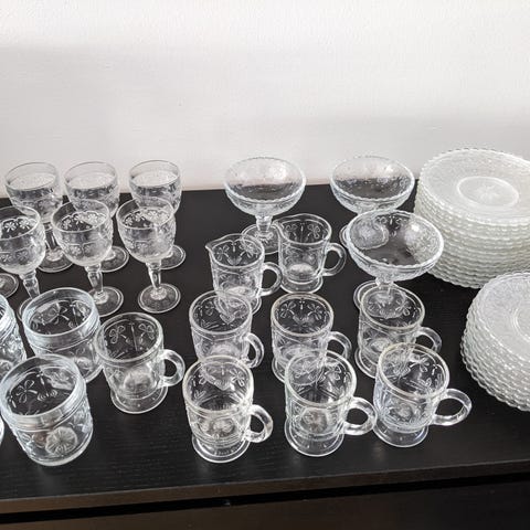 Kerttu Nurmisen Nuutajärven lasille uudistaman Apila-sarjan juomalasi. Sarja oli tuotannossa v. 1977-85. Lasin korkeus on 9 cm, halkaisija 6,5 cm ja tilavuus 21 cl. Myynnissä olevat lasit ovat ehjiä ja muutenkin hyväkuntoisia.