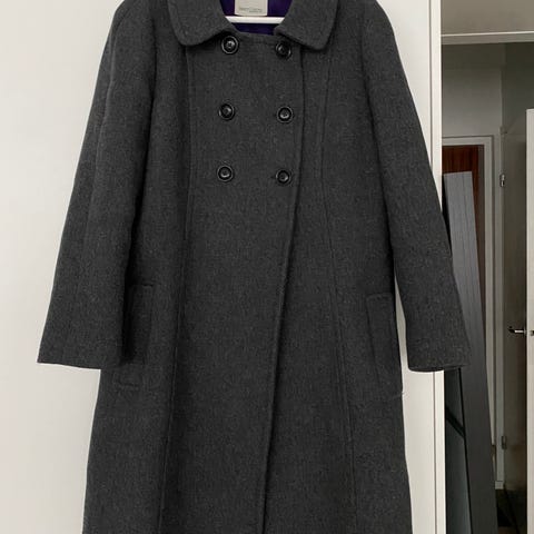 A.P.C.n harmaa herringbone-kuvioinen villakangastakki hupulla. Kyljissä pienet vyöt, joita siirtämällä napista toiseen saa muokattua takin mallia istuvammaksi, tai rennommaksi, tai irrottaa kokonaan. Nappisuljenta, suora, A-linjainen malli. Hyväkuntoinen, ei moitittavaa. Koko S.