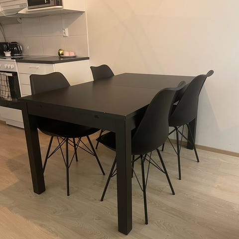 Musta ruokapöytä kahdella 40cm jatkopalalla. Pöytää on siis mahdollista pidentää joko 180cm tai 220cm mittaiseksi. Jatkopaloilla jalat pysyvät paikoillaan eli pituus tulee pöydän päihin.