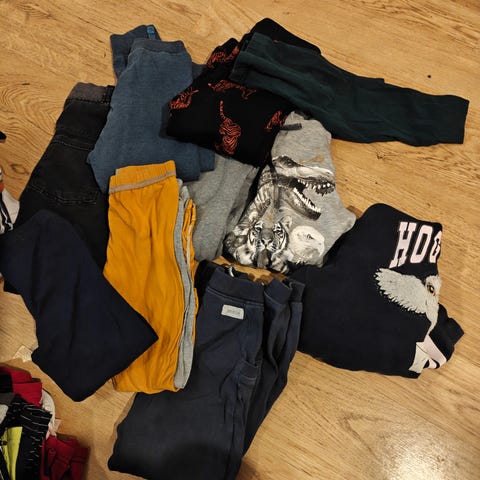 Vaatepaketti pojille koossa 104. Paketissa esim. hoikalle sopivia farkkuja, pitkähihaisia, neuletakki, Noshin collegepaita, Reiman reilut softshell-housut 98 (polvessa pienenpieni reikä päälikankaassa) ja tekninen t-paita 98/104. Jyri-paidassa ja koirapaidassa kulumaa pinnassa. Eläimetön, hajusteeton koti.