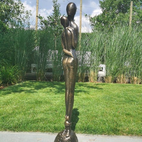 Lisää kotiisi tai puutarhaasi ripaus eleganssia tämän upean valurautaisen minimalistisen veistoksen avulla, joka esittää naista, joka heittää kushin. Tämä nykytaiteen teos on täydellinen sisustuksen kaunistamiseen ja ilmaisun tekemiseen. Ihanteellinen lahja taiteen ystäville ja upea lisä mihin tahansa kokoelmaan. Anna tämän ainutlaatuisen teoksen koristaa tilaa ja puutarhaasi viehättävällä ja ajankohtaisella ilmeellään. Mitat ovat seuraavat (+/-):Korkeus: 32 cm / 12,8 tuumaaPituus: 15 cm / 6 Kaikki tuotteemme lähetetään hyvin pakattuina ja vakuutuksella.