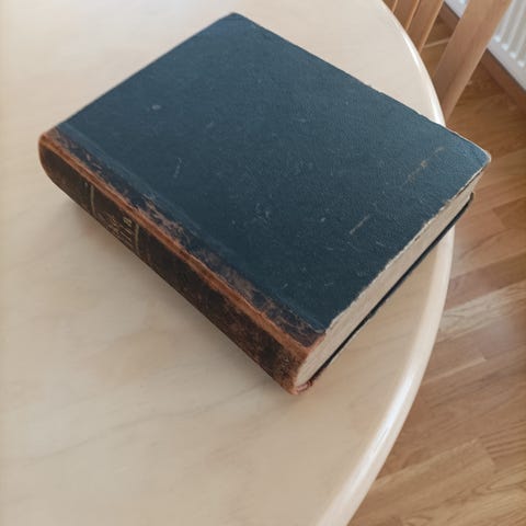 Vanha nahkaselkäinen kirja. Painettu vuonna 1875.