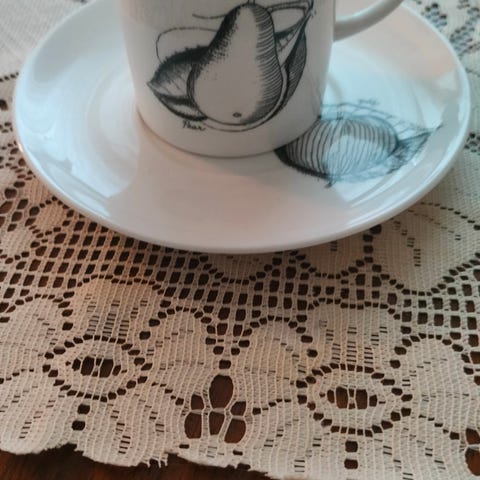 Dunoon Fine Bone China. Leipälautasen halkaisija 20 cm, kupin lautasen 16 cm, kupin halkaisija 8 cm ja kupin korkeus 6 cm.