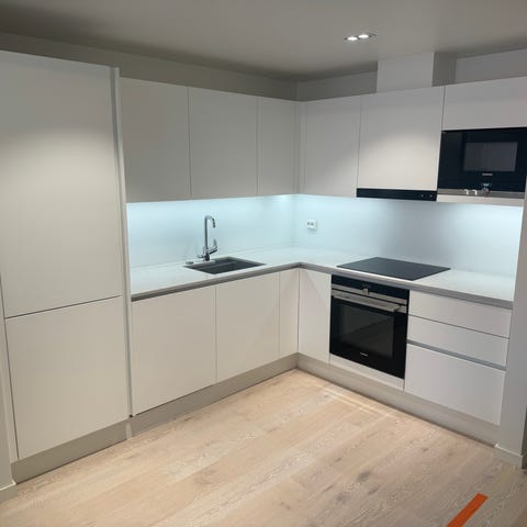 Uudenveroinen keittiön saareke kvartsikomposiittitasolla