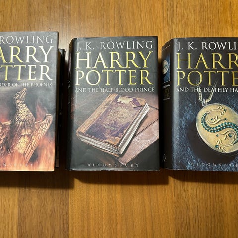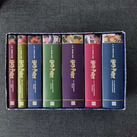 Amerikkalaiset kovakantiset HP kirjat kansilehdillä jykevässä pahvisessa laatikossa. Ei koskaan luettu, kuin uusia. Mukana myös alkuperäinen tarrasetti.