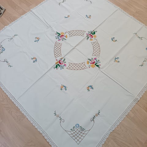 Vintage käsinkudottu villaliina, jossa on ruskea ja beige väritys sekä monivärisiä kuvioita. Liinan koko on noin 42 x 150 cm + hapsut 9 cm. Materiaali villaa. Pitkä ja kapea muoto soveltuu käytettäväksi esimerkiksi pöytäliinana tai seinävaatteena ehkä myös kiikkustuolin mattona. Hyvässä kunnossa. Hinta 14 euroa. Voin lähettää.