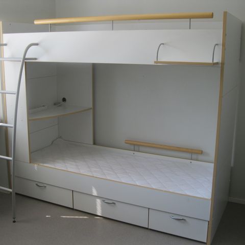 Puinen kerrossänky, jossa tikkaat yläpetiin kiipeämistä varten. Sänky on valmistettu puumateriaalista. Sopii tilan säästämiseen ja makuutilan järjestämiseen huoneessa.