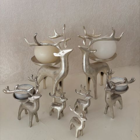 Kolme koriste poroa, isoin on Pentikin 33cm hopeoitu poro, pienin on Pentikin 10cm hopeoitu poro, ja keskimmäinen on n. 19cm korkea tuntematon poro-koriste, mahdollisesti Pentikin.