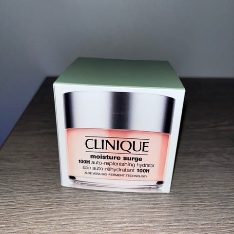 Clinique Moisture Surge 100H Auto-replenishing hydrator. Geelimäinen kosteusvoide jonka luvataan kosteuttavan ihoa jopa 100 tuntia kasvojen pesusta huolimatta. Voide auttaa ihoa muodostamaan oman kosteusvaraston ja säilyttämään kosteuden. Tehoaineina mm. biofermentoitu Aloe vera, hyaluronihappo sekä aktiivinen Aloe vera- vesi. Voide sopii kaikille ihotyypeille päivä- ja yökäyttöön.