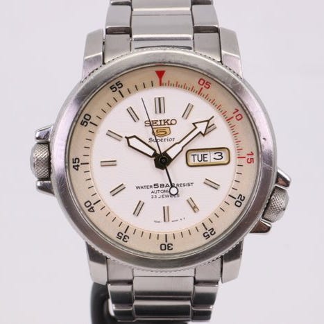 Valmistettu Japanissa**Harvinaisia Seiko-merisiilejä kultaisessa värissä**Malli: Seiko 5 Sports SNZF22J Kultainen Sea Urchins automaattinen sukelluskelloMateriaali: Ruostumaton teräs kullanvärisenäKellonäytön väri: MustaKellotaulun koko: 41 mm (ilman kruunua)Soveltuvuus: Enintään 16,5 cm ranteeseen. Ei lisälinkkejä.Seiko 7S36 automaattinen koneistoVirranvaraus: 40 tuntiaToiminnot: Ajan pitäminen, automaattinen veto, pyörivä kehän kehän, tasaisesti liikkuvat osoittimet, hehkuvat osoittimet ja kellon indeksit, päivä- ja päivämäärän näyttö, kaksoiskielinen päivämääräpyörä—// TOIMITUKSEN SISÄLLÖT //—EiAlkuperäiset asiakirjat: Ei—// EHDOT //—Kotelon kuluminen: Pieniä * (kevyt kulumisen merkkejä kotelon sivuilla, joitakin hiusnaarmuja/ohuita naarmuja, ei merkittäviä kolhuja tai reikiä)Takakannen kulumaa: vähäistä (Näyttöinen takakansi. Jälkimarkkinoiden takakannen kristalli ilman alkuperäisiä painatuksia)Kristallin kuluminen: vähäistä (lähes virheetöntä. Mahdollinen jälkimarkkinoilta ostettu mineraalikristalli)Näytön kuluma: Ei mitäänKäytössä käsissä: Ei mitäänBezelissä kulumaa: Pienet maalin irtoaminen ja naarmuja sisärajassa. Kolhu pipin kolmion kohdalla ja merkintä "10"Kruunun kuluminen: merkityksetönKäytön jälkiä rannekorussa tai -hihnassa (edellä mainittu kiinnitys): Pieniä kulumia (Seiko S/S rannekoru kultaisena [joistakin maalia irronnut rannekkeen sivulta], 10 linkkiä kiinnitetty)Käytä lisäremmeillä: Ei käytössä (jälkimarkkinoiden mustat kumiremmit, sopivat jopa 21 cm:n ranteisiin)KUNTOARVIOINNIN STANDARDI:Ei mitään (Paras) > Merkityksetön > Pieni > Keskitaso > Raskas > Vaurioitunut (Huonoin)— // KOKONAISARVIO //—ARVIO: A / B+ARVOSTELUN OHJEN - Uusi ilman käytön merkkejä tai käyttämätön.Lähellä mint-kuntoa, vähäiset kulumisen merkit.A+ - Erinomaisessa kunnossa, vähän käytetty ja vähän kulumisen merkkejä.A - Hyvässä kunnossa, kevyitä käytön merkkejä tai naarmuja.B+ - Kohtalaisessa kunnossa, jossa on ilmeisiä kulumisen tai naarmujen merkkejä.B - Huonokuntoinen, runsaasti kulumisen merkkejä tai naarmuja.V - yli 20 vuotta vanha ja vintage-kunnossa, jossa on ilmeisiä kulumisen ja naarmujen merkkejä.ND - Pelastustilassa, toimimaton tai huoltoa vaativa. Saattaa puuttua osia.—// Toimitustapa //—PALVELU: FedEx Economy tai vastaava—[[[ Asiakkaille huomautuksia ]]]—Valokuvat- Kaikki valokuvat eivät ole retusoituja (paitsi sarjanumeroiden osalta, jotka on piilotettu turvallisuussyistä). Mahdolliset kuvaamattomat mutta näkyvät viat katsotaan kuvien perusteella kuvailluiksi. Kuva puhuu tuhat sanaa, joten pyydämme teitä katsomaan kuvia huolellisesti ennen tarjouksen tekemistä, sillä ne muodostavat olennaisen osan kuvauksesta. Arvostan asiakassuhdettani, enkä halua olla pettymys, kun tuote saapuu ei-toivottujen tulosten kanssa.tarkkuus- Tarkkuus testataan jokaisessa kellossa vaakasuorassa asennossa (kellotaulu ylöspäin) täysin windatun varaustilan ollessa voimassa, ja sen katsotaan riittäväksi ajan pitämiseksi ennen kuin kellon toimittamme liikkeestämme. Jotkut tekijät, jotka voivat vaikuttaa tarkkuuteen, ovat ranteessa vietetty aika, käsivarren liike ja jousen jännitys. Kellot, jotka ovat yli 10 vuotta vanhoja, saattavat kokea suuremman tarkkuuden vaihtelun ja epätasaisuutta mekaanisen kulumisen vuoksi.Aitous- Kaikki myymäni rannekellot ovat aitoja. Yritän merkitä kaikki jälki
