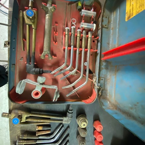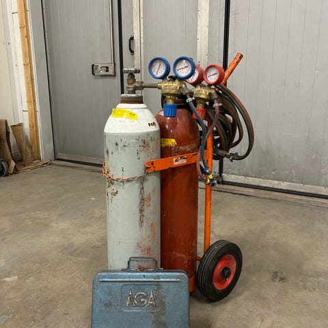 Kuvassa on Elgan laatikko ja Harrisin. Molemmat maksoivat uutena 500€. Molempia saa edelleen uutena. Lisäksi kuvassa on töhöpoltin ja kaasupullomittarit sekä letkut.