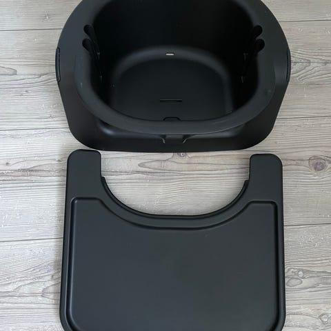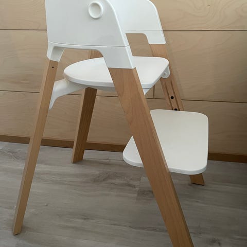 Stokke Steps syöttötuoli musta istuinosa ja puunväriset jalat. Etukaari, tarjotin ja jalkatuki. Yhdellä lapsella käytössä ollut, joitakin käytönjälkiä, mutta ehjä ja siisti.