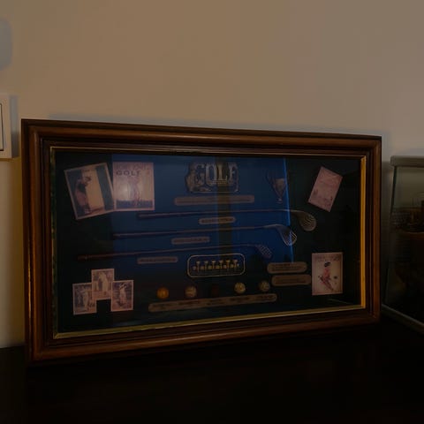 Lasitettu ja puinen vitriini, jossa on erilaisia jäljennöksiä, jotka dokumentoivat golfin historiaa (mailat, pallot jne.). Kotelo 107 cm x 34 cm.