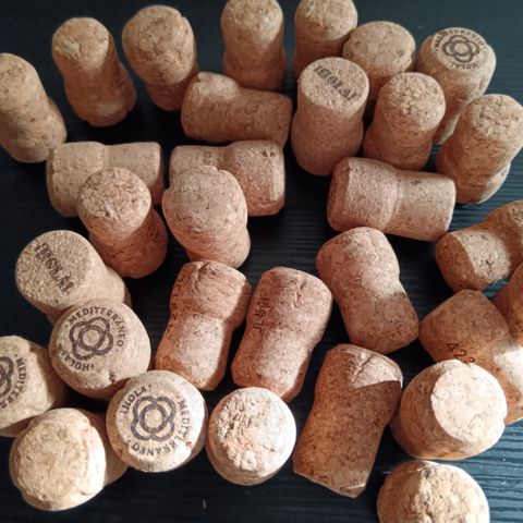 Viini-, kuohari- ja skumppapullojen korkkeja yhteispainoltaan noin 2477 grammaa. Sopii esimerkiksi askarteluun tai keräilyyn.