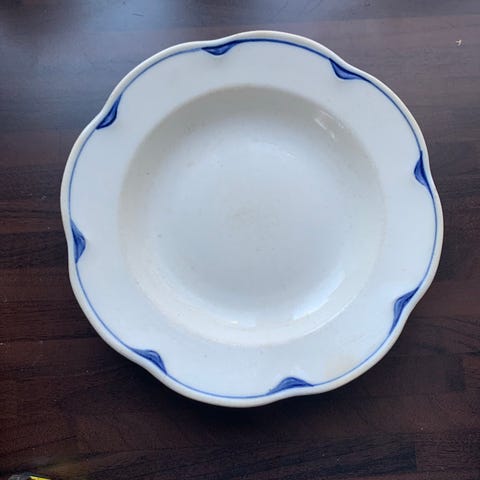 Arabia Pekka-sarjan kaksi matalaa lautasta halk. 22cm, valkoinen posliini sinisellä reunakoristeella. Hyväkuntoiset, Pekka-leimalla.