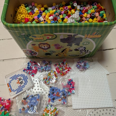 Myydään iso kasa Hama helmiä. Suurin osa on ns. tavallisen kokoisia ja pieni määrä minihelmiä. Mukaan saa monta hyväkuntoista alustaa. Kuvissa näkyvät rasiat, laatikot yms kuuluvat pakettiin.