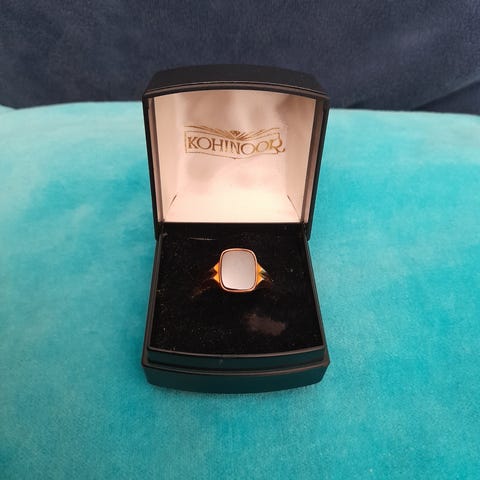 Kuvien kultainen kantasormus sinisellä Onyx (?) kivellä . Koko noin 21-22 ja 14K kultaa.