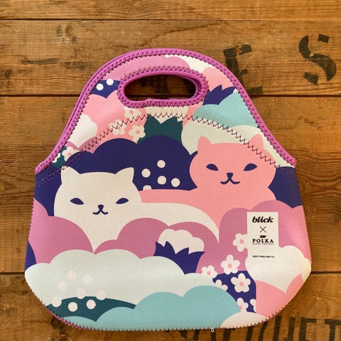 Söpö vetoketjullinen käsilaukku/eväslaukku. Suunnittelija Polka Paper. Protokappale valmistettu japanilaisen yhteistyökumppanin toimesta Japanissa. Koko: n: 30x30cm. Materiaali: Keinokuitu.