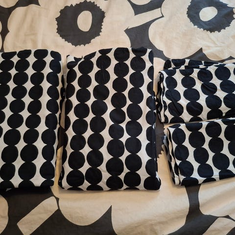 Myydään Marimekon räsymatto kuosin pussilakanasetti. Tuplapussilakana (koko 240cm x 220cm) sekä 2 kpl tyynyliinoja.