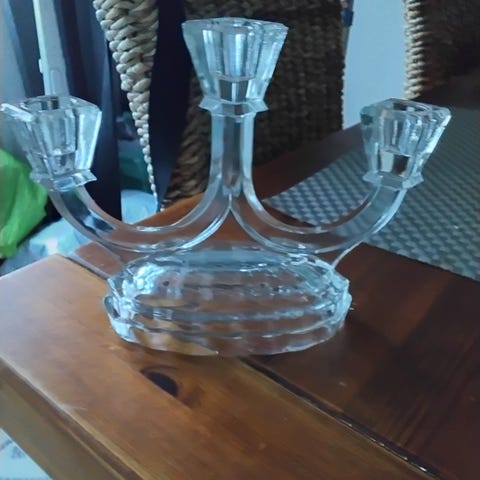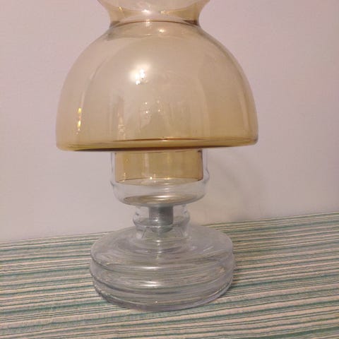 Riihimäen lasin valmistama ja Nanny Stillin suunnittelema Apollo kynttilälyhty. Pientä jälkeä kirkkaan lasin yläreunalla. Kynttilän metalliosa puuttuu.