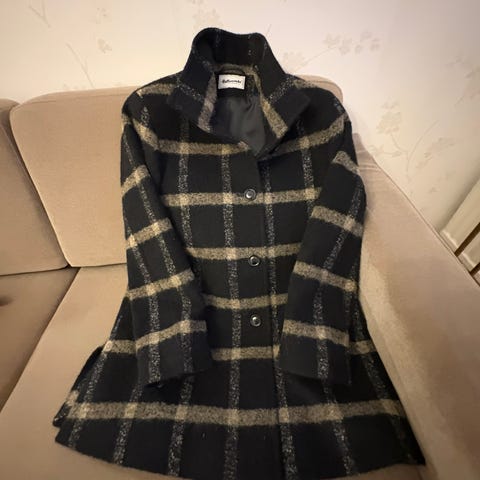 Haloselta ostettu musta-valkoinen Hansmark-villakangastakki, koko 42. Takissa on kiinteä huppu ja varanappi löytyy. Takki on mukavan kevyt päällä.