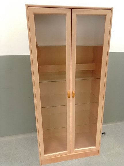 Tumma hyllykkö kaapilla ja vitriinillä. Ylä- ja alaosa voidaan irroittaa erillisiksi. Vitriiniosassa valo ylimmän hyllyn takana.