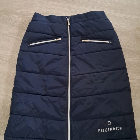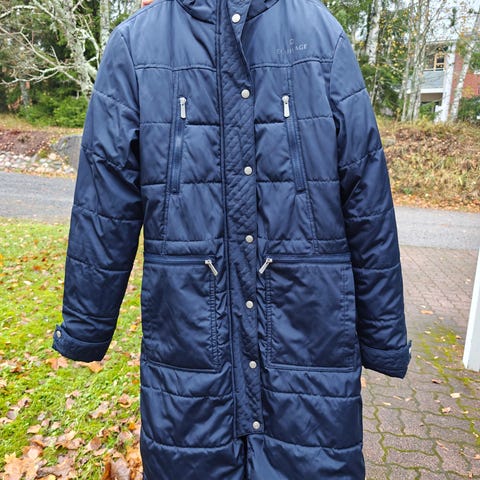Equipage naisten pitkä ratsastustoppatakki, väriltään sininen. Takissa on irroitettava huppu, takana halkiot sekä napit edessä. Toinen jalkalenkki mennyt rikki ja sitä ei ole ja hupun toinen kiristys nyöri lähtenyt paikoiltaan (näkyy kuvassa), mutta toimii silti. Koko XL. Ostettu vuonna 2020 ja ovh ollut 159€.
