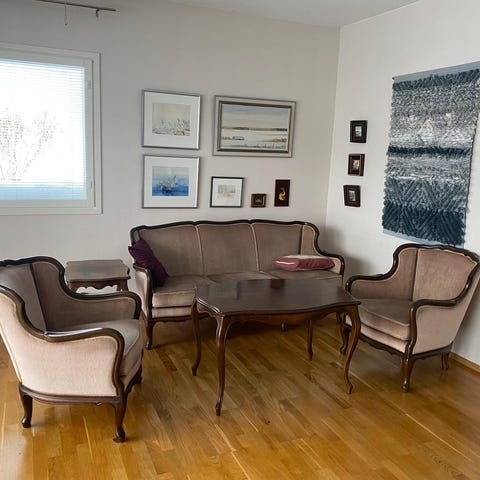 Tyyli Art Ky:n käsinveistetty sohvaryhmä.