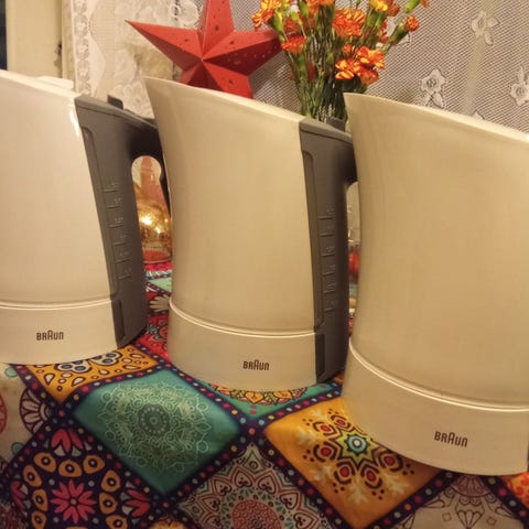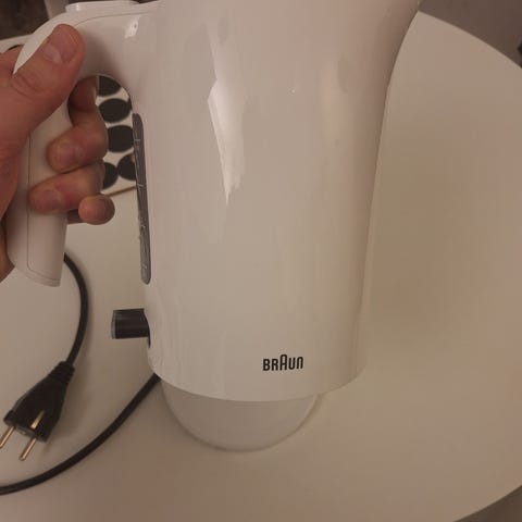 Braun vedenkeitin valkoisella värillä. Sähkökäyttöinen vedenkeitin, jossa on vesimäärän mitta-asteikko. Soveltuu veden keittämiseen kotitalouskäyttöön.