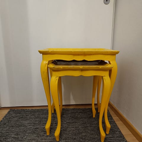 Ikean vaalean harmaat sivupöydät.Mitat näkyvät kuvissa.Pinnassa pieni lohmu yhdessä kohdassa,näkyy neljännessä kuvassa.Muuten pinta erittäin siisti.