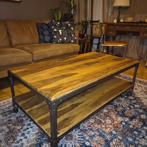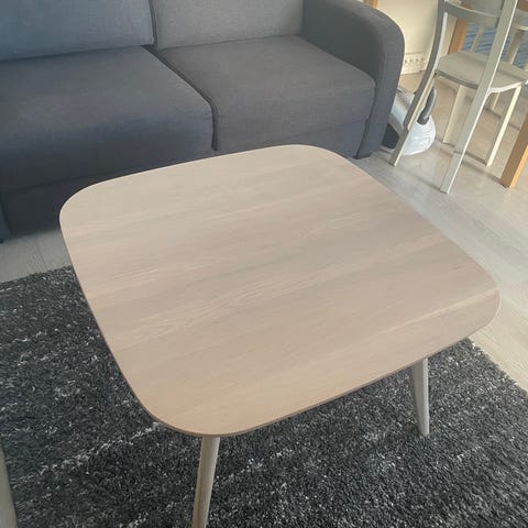 Myydään tukeva täyspuinen sohvapöytä. Mitat n. 110 x 45 x 66 cm. Mäntyä ilmeisesti. Kannessa maalin läpi kuultaa osa oksien kohdista kellertävänä. Eläväinen pinta: puun syyt erottuu maalin alta. Pientä käytön jälkeä löytyy, mutta ei ole pahoinpidelty.