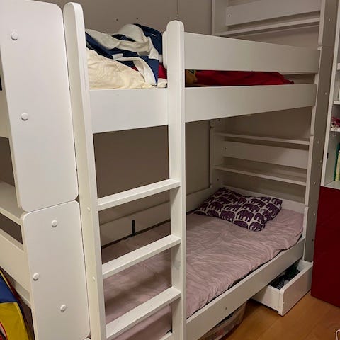 Myydään todella siisti ja hyväkuntoinen pieni kerrossänky, ei juuri uudelle häpeä! Mukaan koko paketti: Ylä- ja alasänky, tikkaat, alasängyn lisälaita, sängynaluslaatikko ja paksut uudenveroiset patjat (käytetty patjansuojusta).