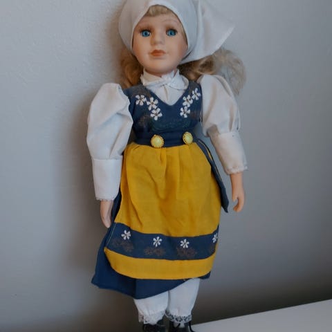 Vanha posliininukke (tuella), ruutumekolla ja hatulla. Ei tietoa mistä aikoinaan ostettu. Muuten hyvässä kunnossa, mutta tohvelien pohjat hieman irronnut. Nuken koko noin 45cm.