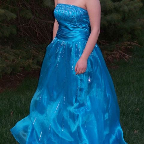 Turkoosi juhlapuku naisten koossa 46. Puvussa on nauhakiristys selkäpuolella joten kokoa voi vaihdella 44-48. Satiinijakku 3/4 hihalla tulee mukaan.