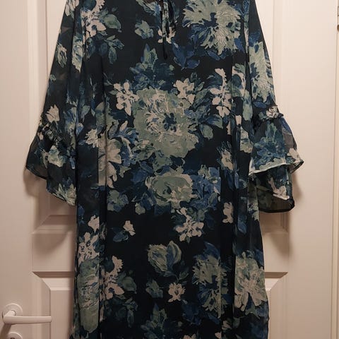 Zhenzi sifonkimekko upeana viininpuna-mustana. Kankaassa on makea seeprakuosi ja siftaavia kukkakuvioita. Mallissa on ilmeikäs hiha kuminauharesorilla ja sivuilla solmittavat nauhat. Pääntiellä on kapea frilla ja edessä pääntien alla hiuslaskoksia sekä koristenappeja. Alla on hyvin joustava viskoosivuori (ei hihoissa). Mitoitus on hyvin reilu ja malli suora. Mukana varanappi.