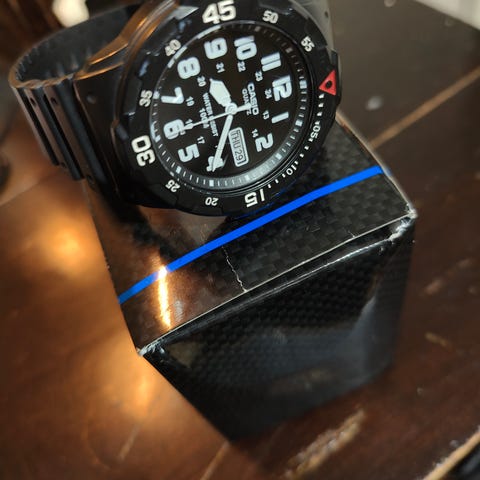 Kuvien mukainen Casio-kello. Kestää kaiken, jos ei vasaralla lyö. Mukava, kevyt, luotettava. Maailman aikavyöhykkeet, sekuntikellot, herätykset ja muut mukavat toiminnot löytyy. Vihreä kangasranneke.