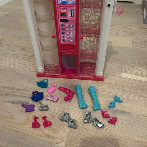 Barbien vaatekaappi ja 9 henkaria. Kaapissa on kiinteä tanko, ulos taitettava tanko, yksi laatikko ja hyllyjä sekä kummassakin ovessa 4 ripustusnuppia. Pieniä kulumisen jälkiä mutta muuten hyvässä kunnossa.
