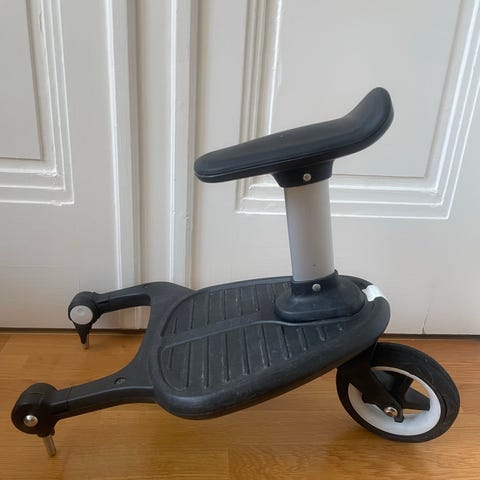 Bugaboo istuinlauta. Ollut käytössa, mutta toimii edelleen. Adapterista puuttuu toinen ruuvi. Meillä ollut Bugaboon Donkey vaunuissa.