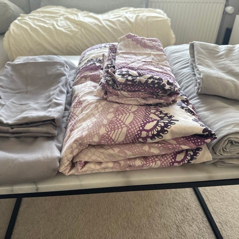 Pari kertaa sängyssä olleet lakanat. Pesty, tahrattomat.